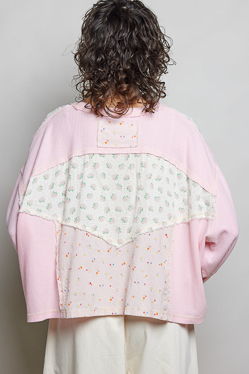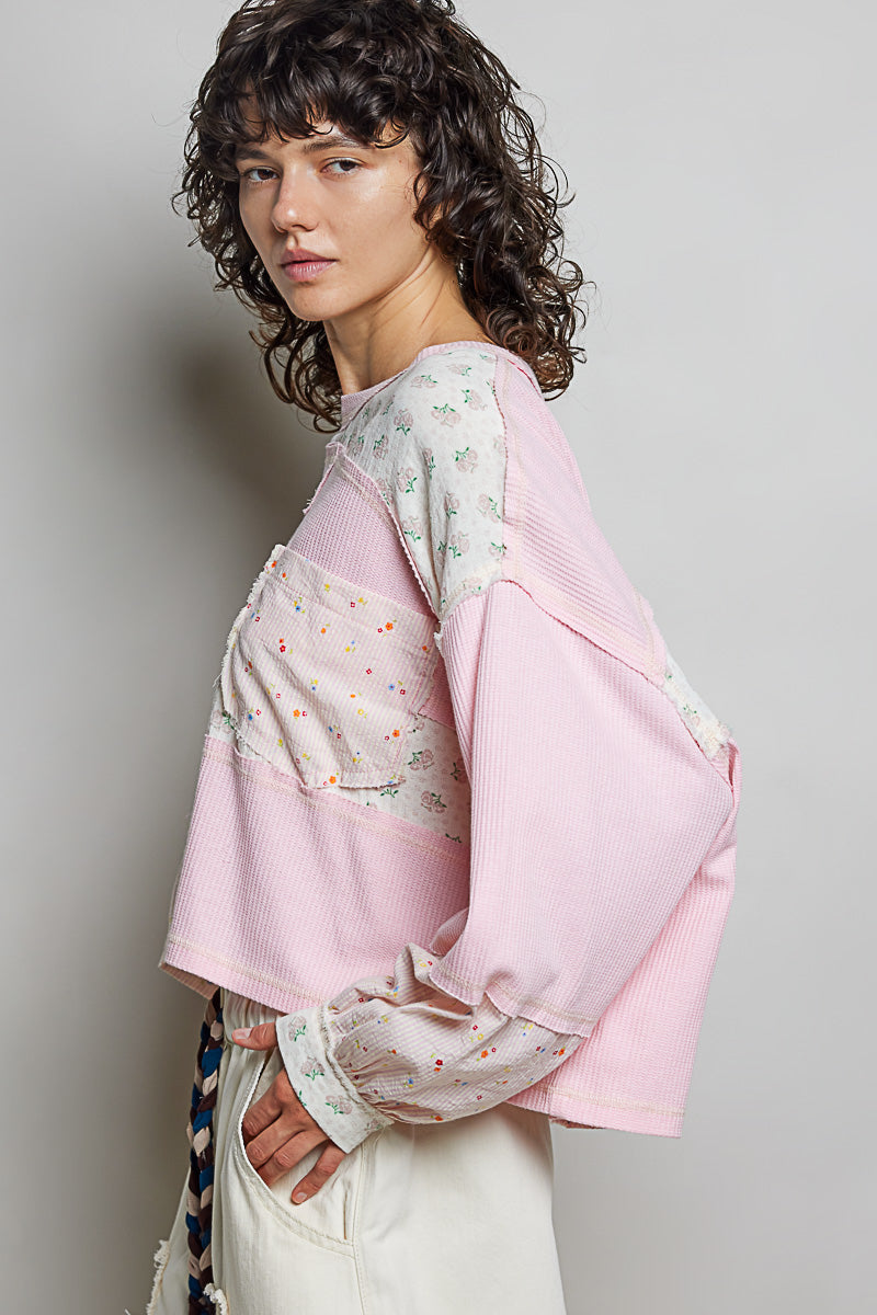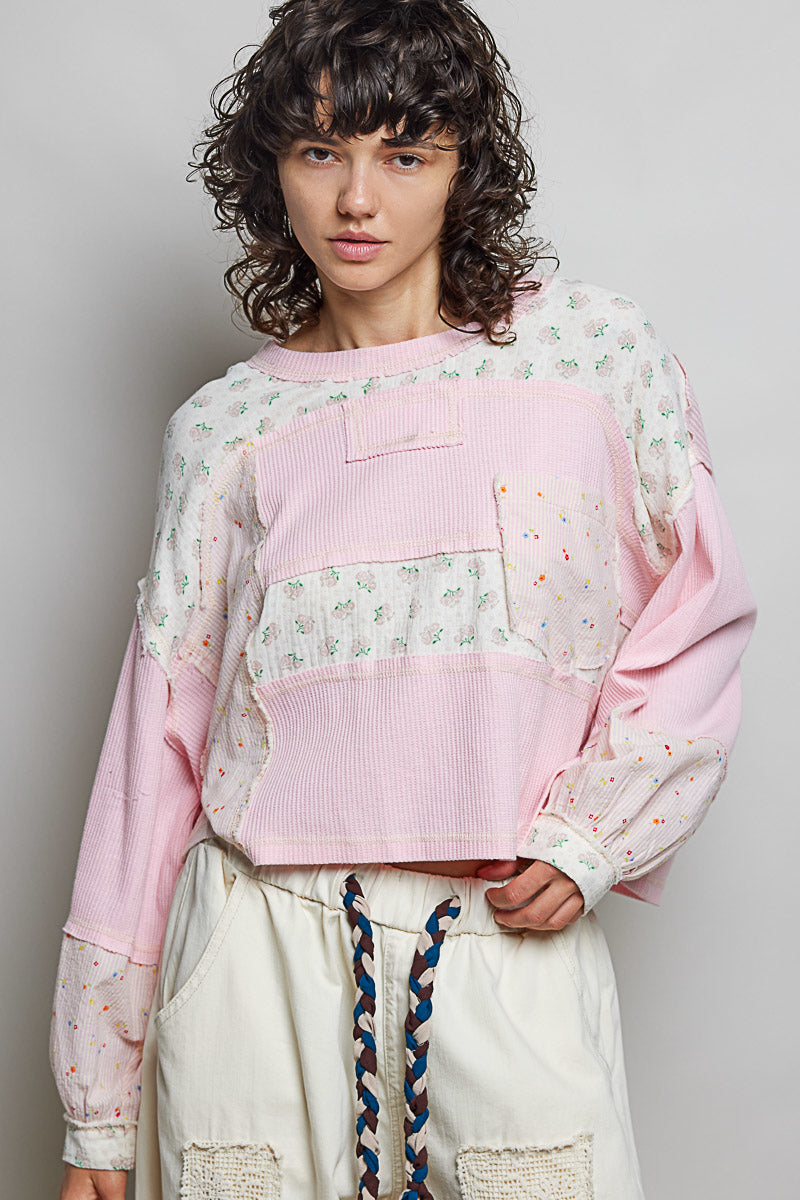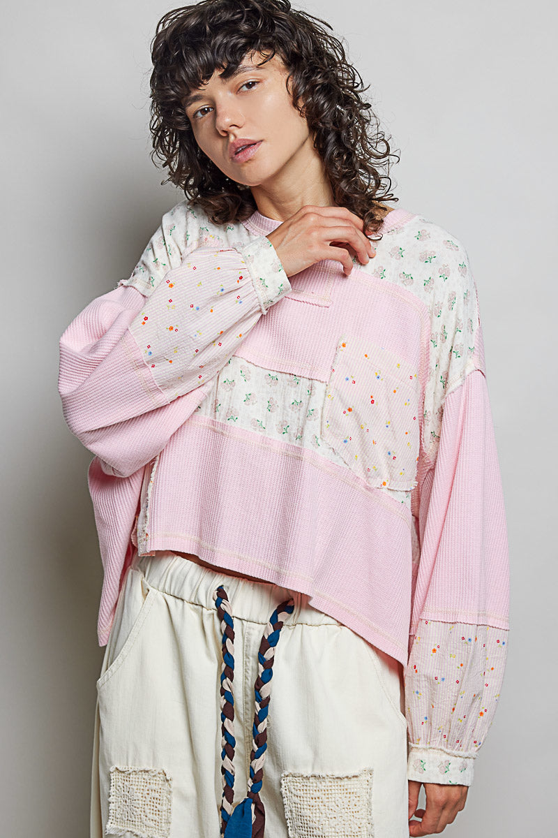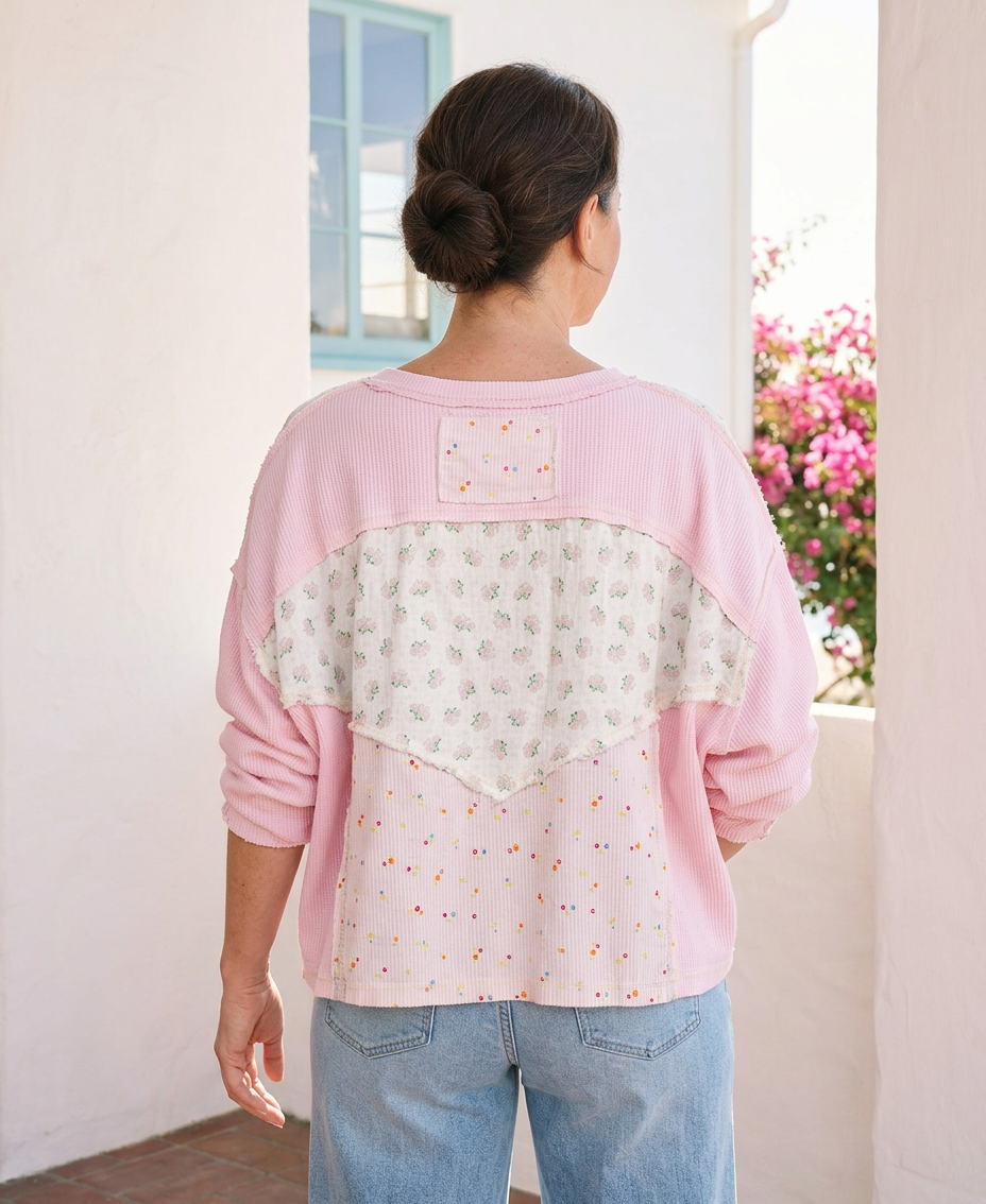 Designed in a round neck long sleeve relaxed fit top, the Delilah Patchwork Knit features a beautiful thermal fabric with mixed floral and ribbed pattern contrasts throughout. The piece showcases thoughtful stitch detailing that adds visual interest and dimension to the design. The relaxed silhouette offers comfortable everyday wear, while the patchwork aesthetic brings a charming, layered look perfect for casual styling. The combination of soft textures and complementary patterns creates a versatile piece that works beautifully on its own or layered under jackets and cardigans.