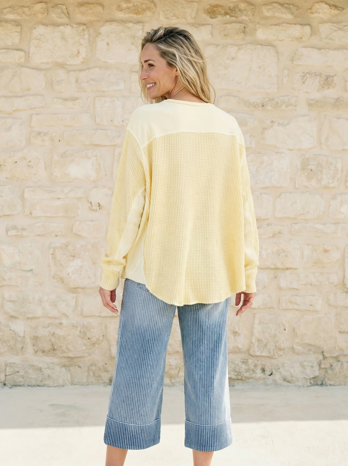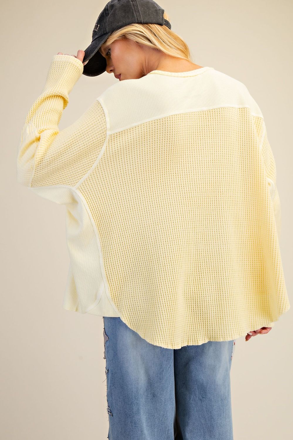 Designed with a relaxed, slightly oversized silhouette, it features a classic henley neckline with a functional button placket for added detail. The soft thermal texture adds dimension, while raw edge accents give it that easy, worn-in finish. Lightweight yet cozy, it’s the kind of staple you’ll reach for again and again.
