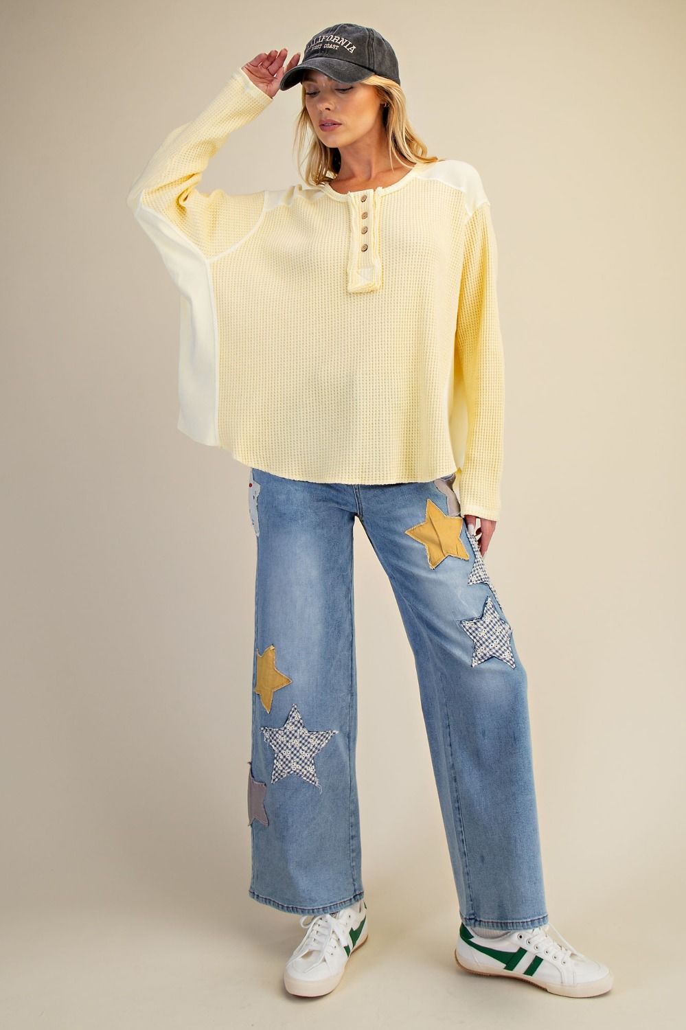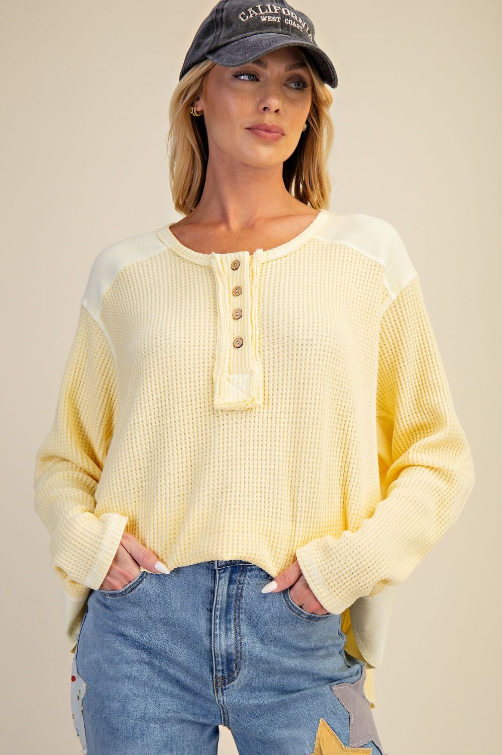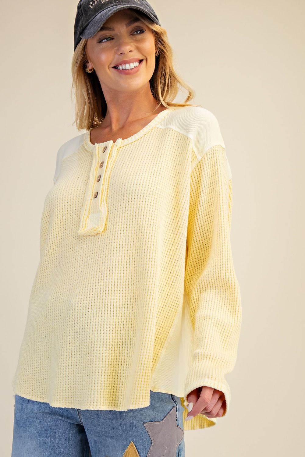 The Evie Washed Henley is the perfect spring and everyday top, designed in a soft waffle knit with a relaxed, lived-in feel that’s both comfortable and easy to style. Whether paired with denim, leggings, or layered over a tank, this top brings an effortless look to casual outfits, weekend plans, and everyday wear.