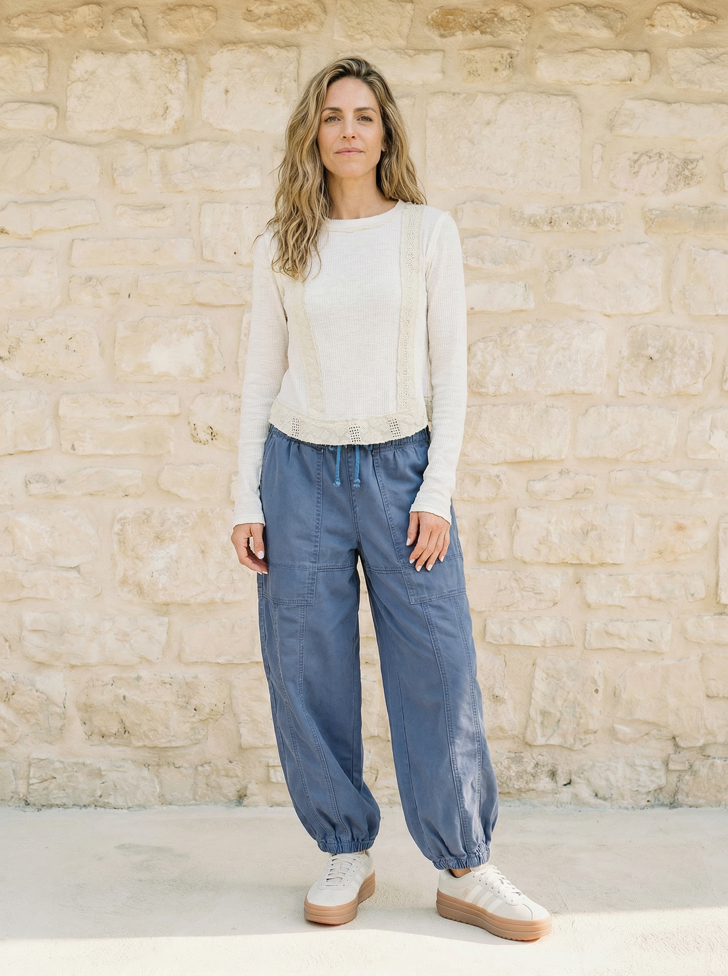 Easy, relaxed, and made for everyday comfort — the Sunday Cargo Pants bring together soft washed twill and a laid-back utility feel. Designed with a baggy fit, tapered legs, and bold patch pockets, they strike the perfect balance between effortless and put-together. Contrast stitching adds subtle shape, while the elastic drawstring waistband keeps them comfy from morning errands to slow weekend lounging. These are the kind of pants you’ll want to live in.