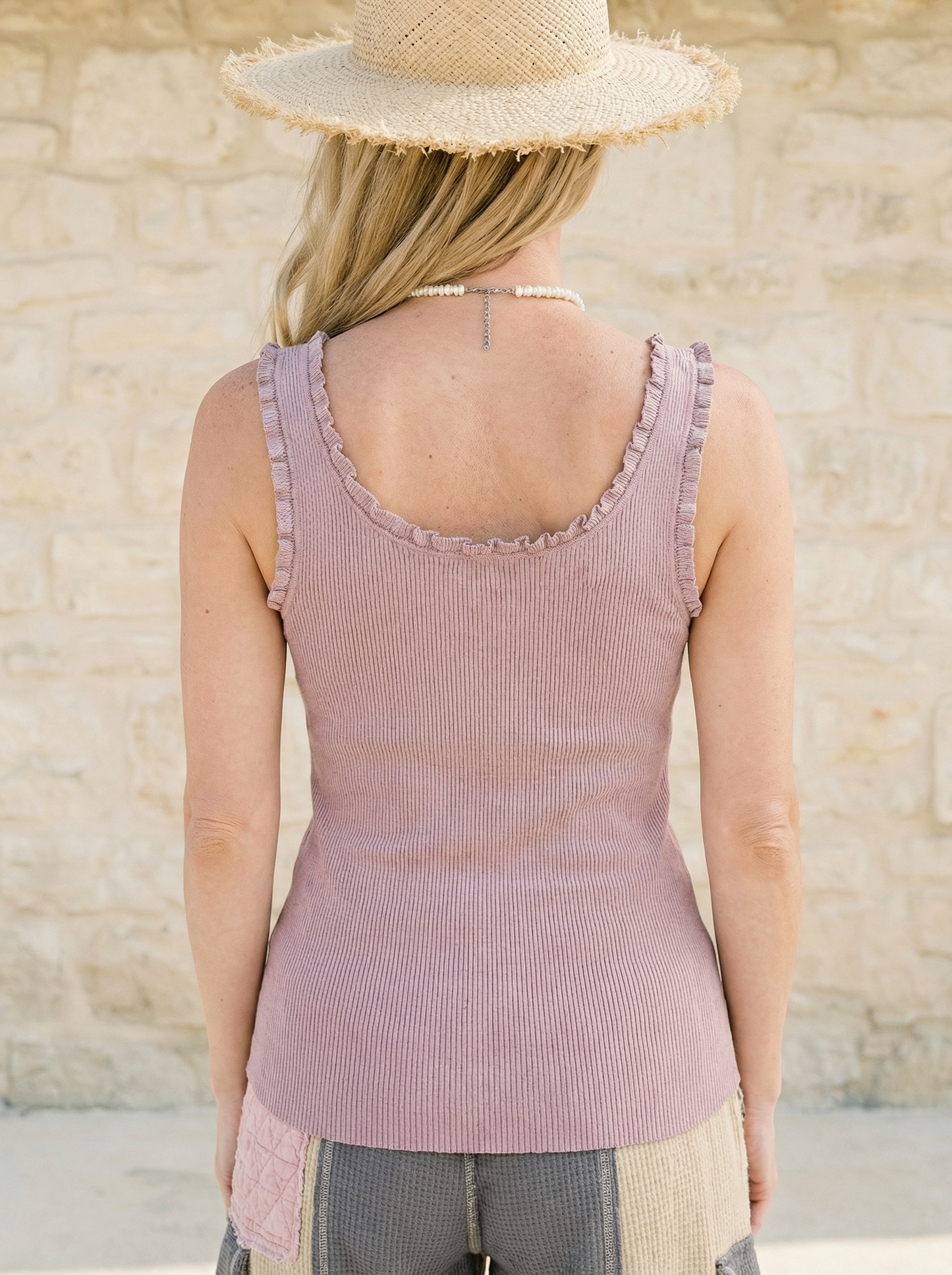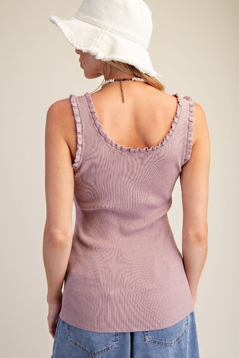 A feminine staple with just the right amount of detail. This fitted ribbed tank features a soft scoop neckline finished with delicate ruffle trim and a three-button henley placket for an elevated everyday look. The stretchy knit hugs comfortably while still feeling breathable and easy to wear.