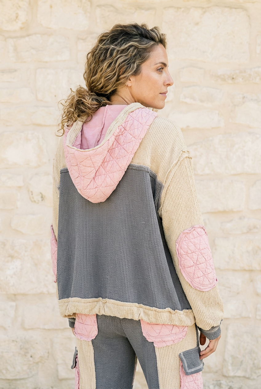This shacket mixes cozy texture with bold, artisan-inspired detailing for a statement layer that feels both vintage and modern. Designed in an oversized silhouette, this button-down jacket features a unique blend of thermal knit, quilted panels, and cut-and-sew sweater knit for a dimensional, handcrafted look. The hood and tassel drawstrings add a relaxed, wander-ready feel, while the curved patchwork shapes and contrast stitching elevate the entire design.