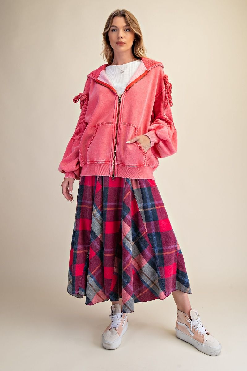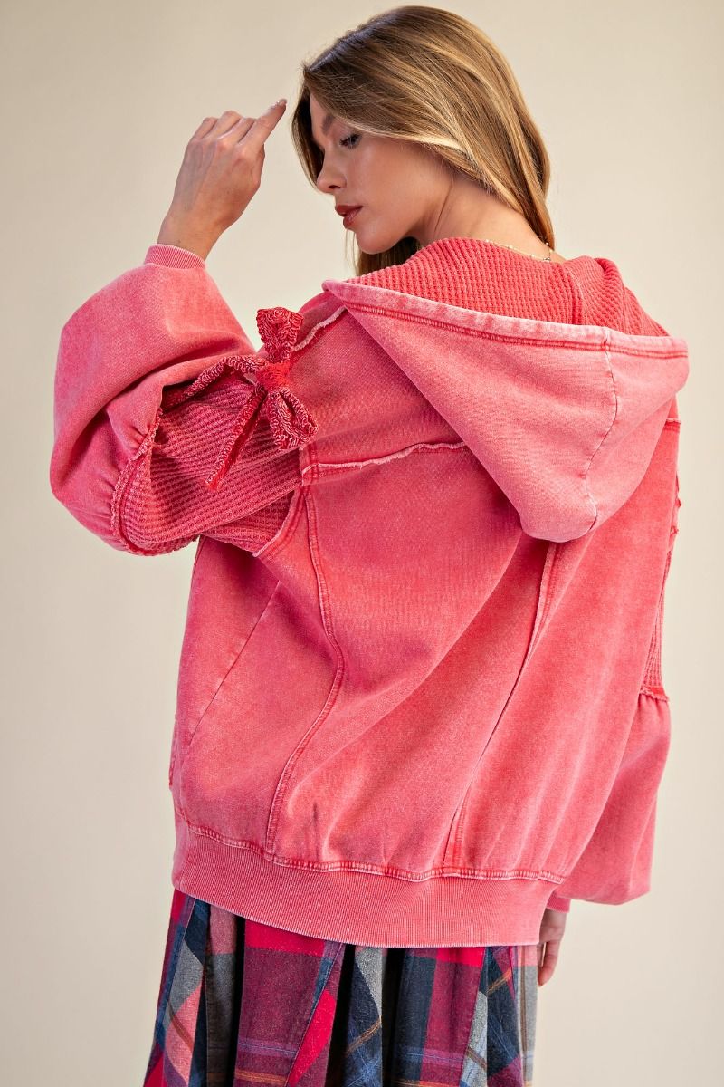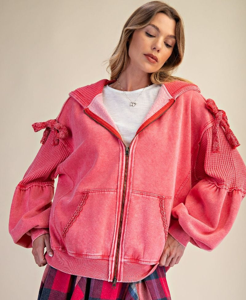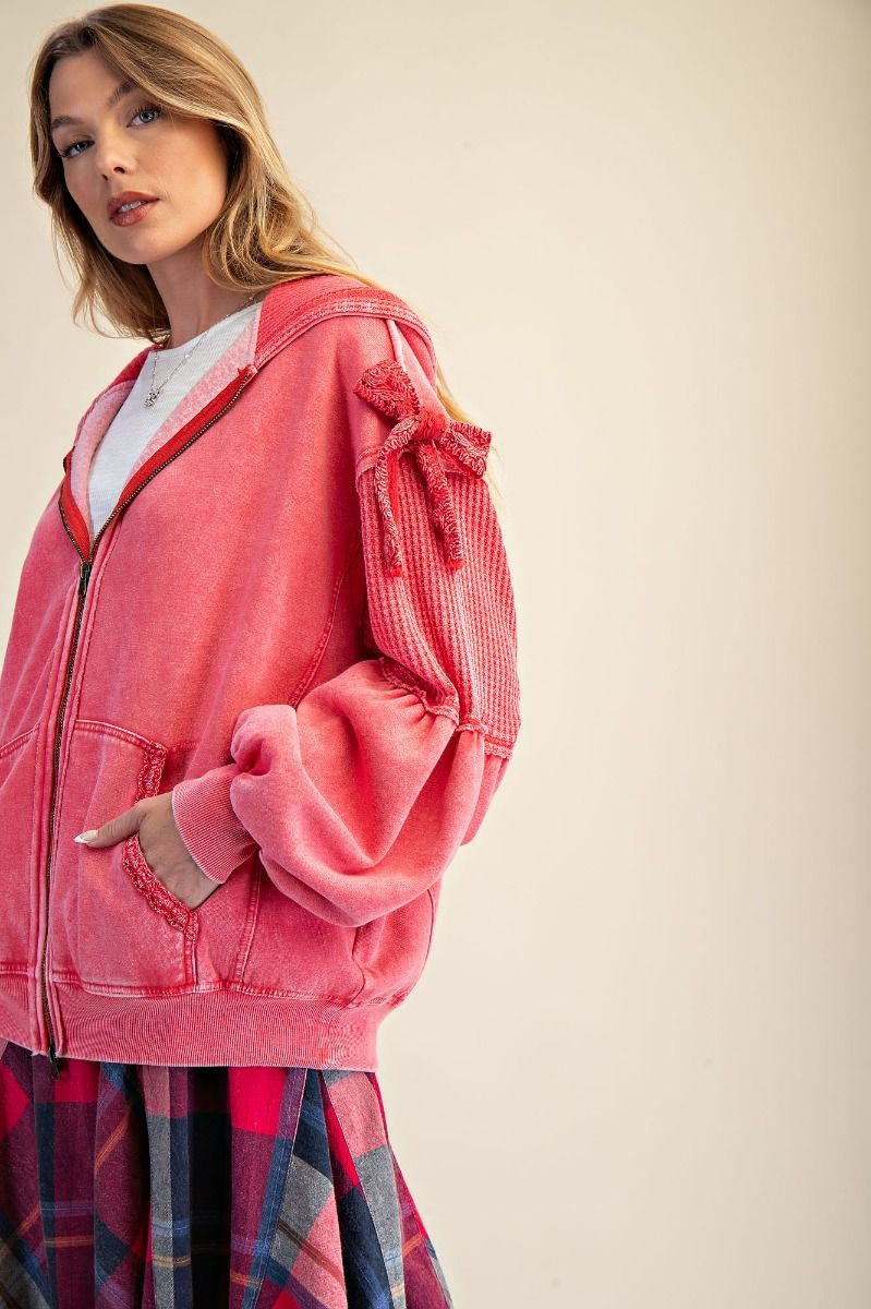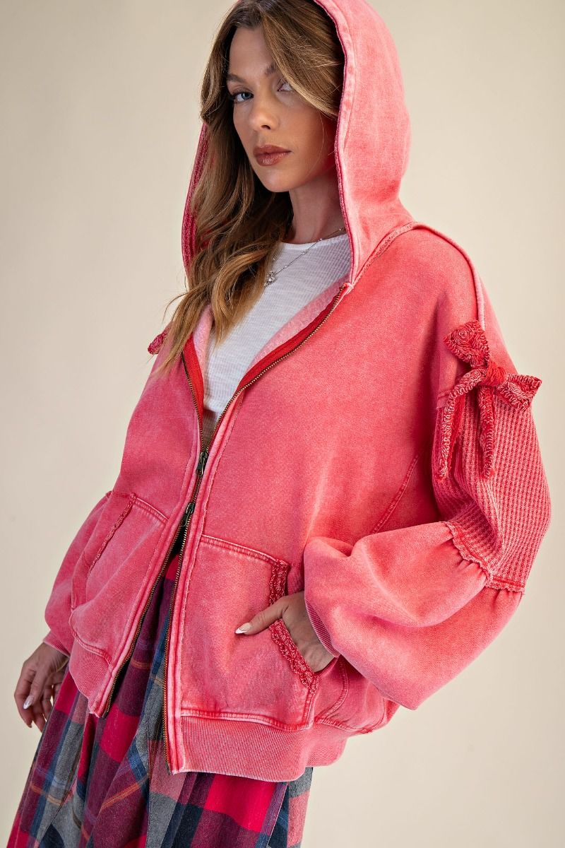 Meet the perfect blend of cozy and cute — this washed terry zip-up brings all the charm with its relaxed fit and playful textured details. The attached hood and full zip closure keep it easy and casual, while the waffle-knit contrast panels add that extra bit of dimension we love. The sleeves are finished with the sweetest tie-bow details for a subtle, feminine touch, and the front pockets make it an effortless throw-on layer. Finished with a mineral-washed look for that soft, lived-in feel, this hoodie is the kind of piece you’ll reach for again and again.