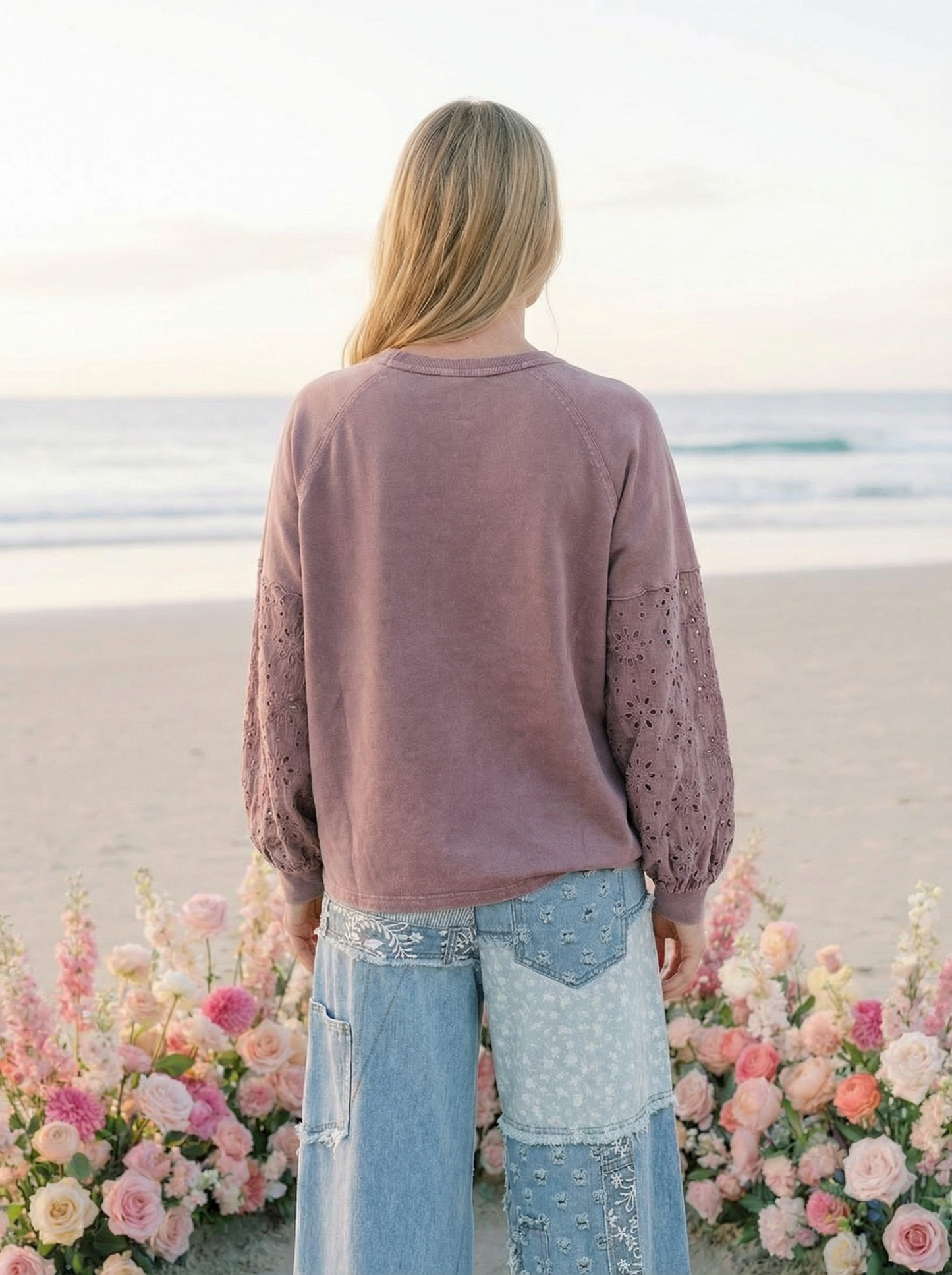 A blend of soft texture and vintage detail, this neutral top features delicate crochet appliqués and airy eyelet balloon sleeves that bring a feminine, handcrafted feel to your everyday look. Designed in a relaxed silhouette with subtle charm, it pairs beautifully with denim, skirts, or your favorite patchwork pieces for that effortless boho touch.