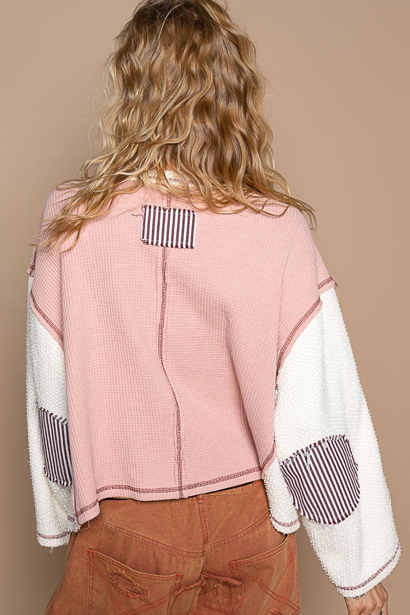Designed in round neck, wide sleeve, oversized fit top in thermal and fleece mix with raw edge detail pointed solid pattern. - BUST: 29-3/4" - LENGTH: 20" - SLEEVE: 19" - SHOULDER: 22-1/2"