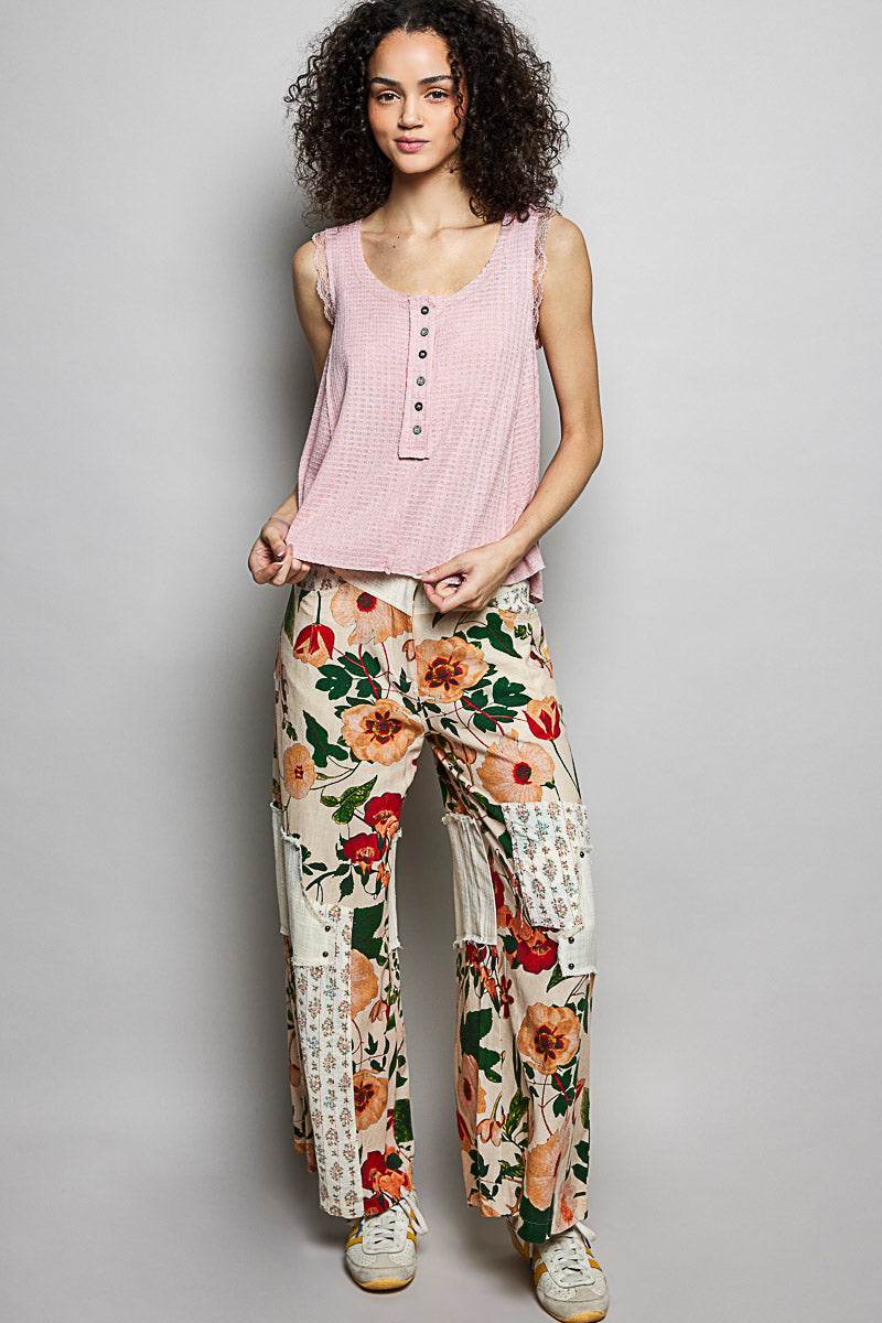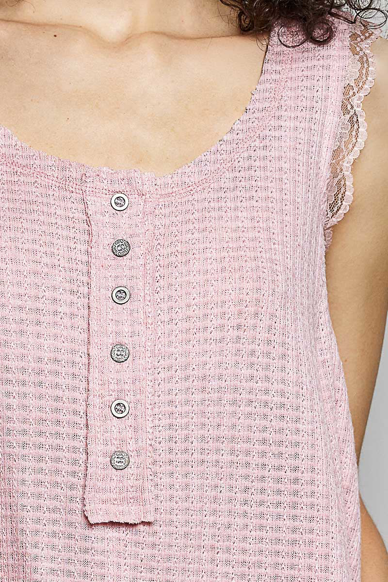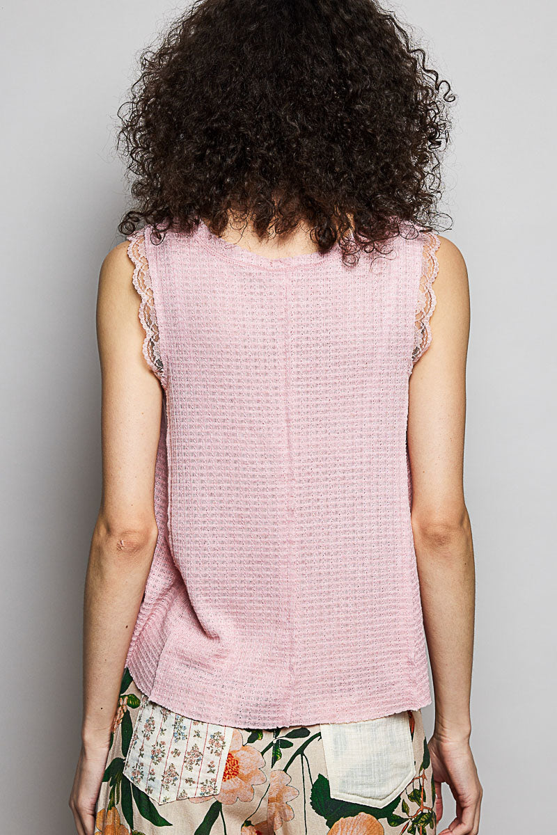 Effortless Waffle Knit & Lace Tank - Pink