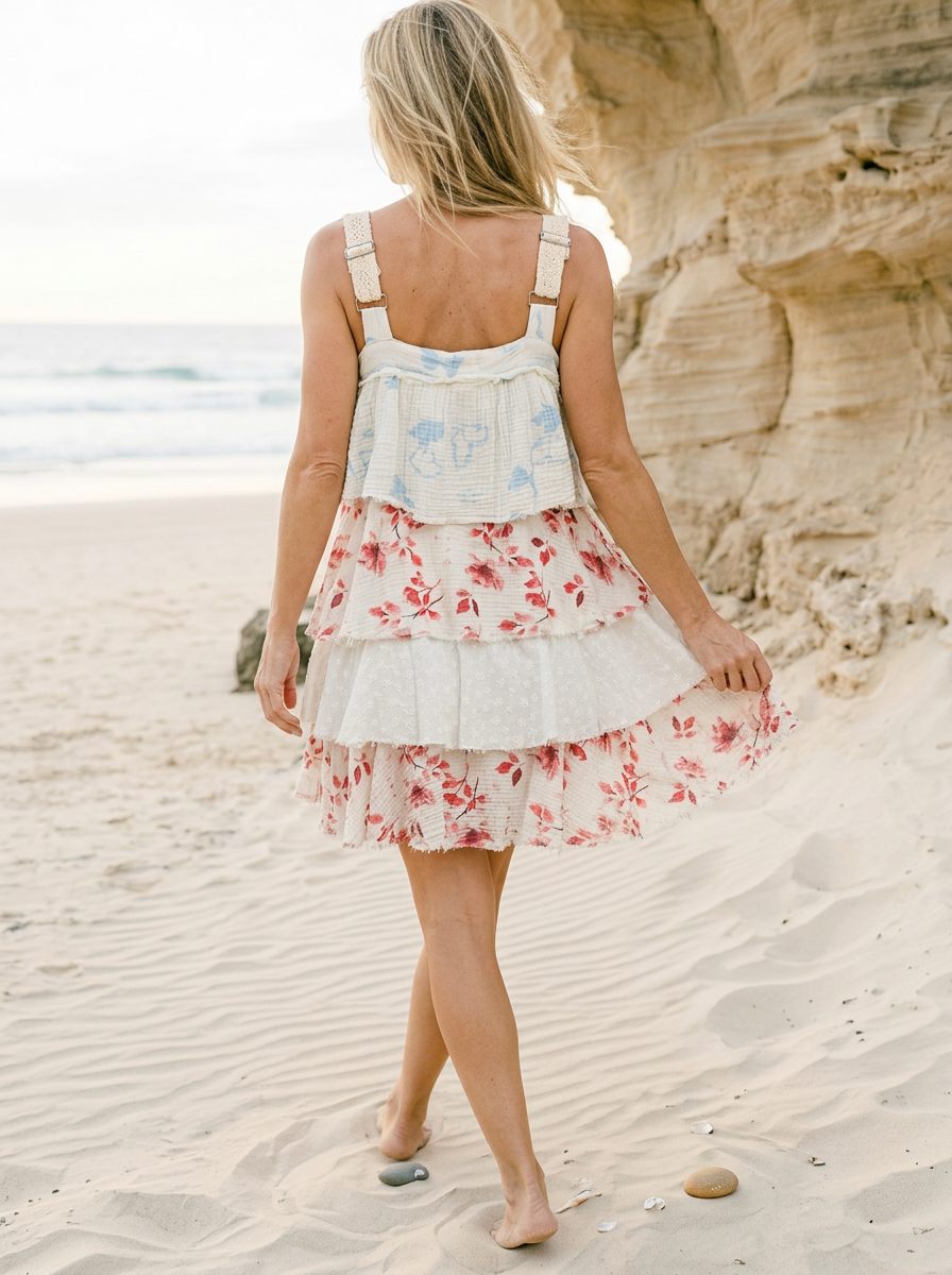 The layered ruffles bring dimension and softness, making it perfect for everything from sunny day outings to weekend getaways. Style it with sandals for an easy daytime look or dress it up with boots and layered jewelry for something a little more elevated.
