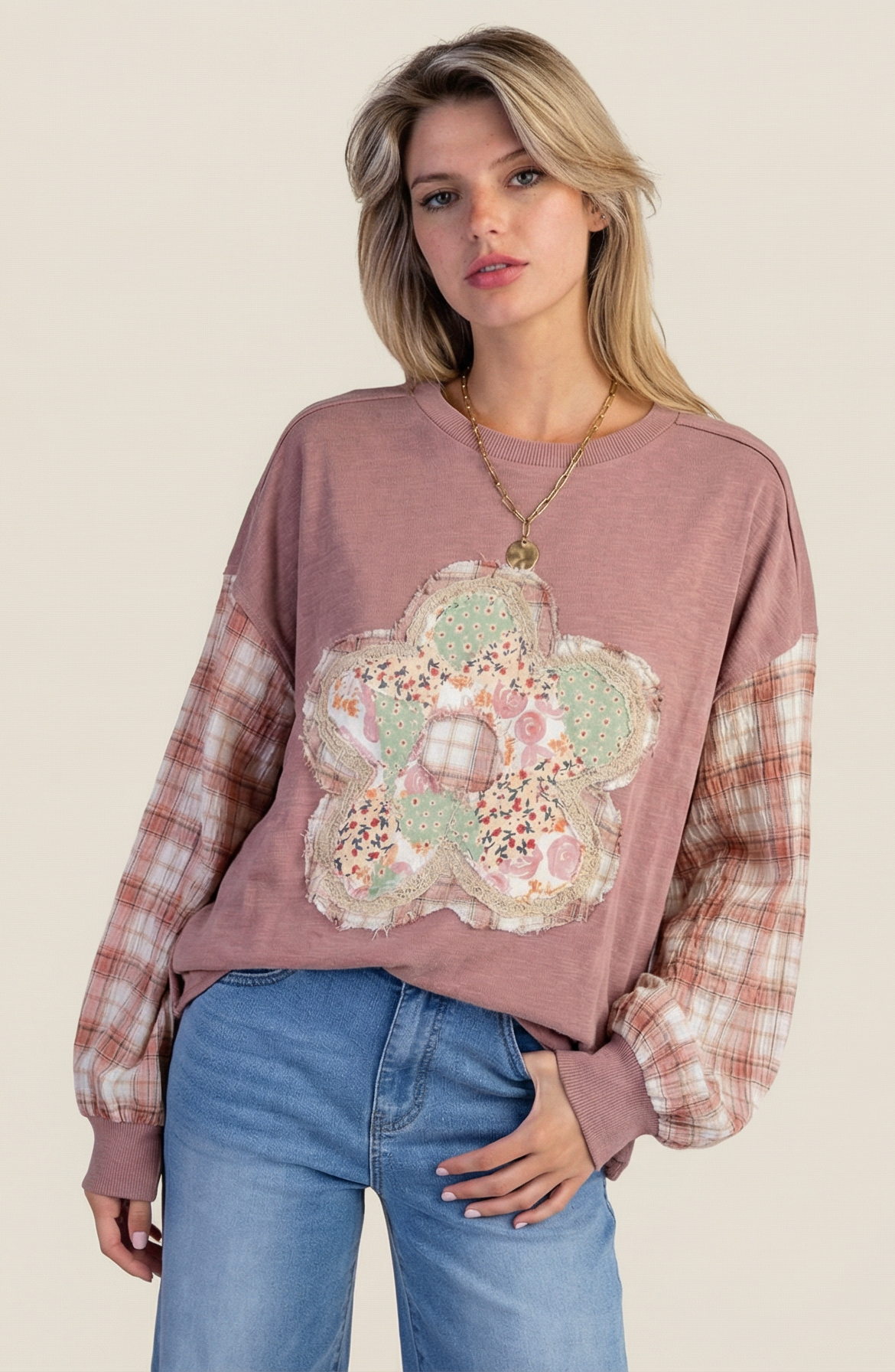 A true statement piece with the sweetest vintage-inspired touch. This pullover features an oversized floral patchwork appliqué made from mixed prints and layered textures, giving it that handcrafted, heirloom feel. The contrast long sleeves add dimension and personality, while the soft knit body keeps it comfortable and easy to wear.