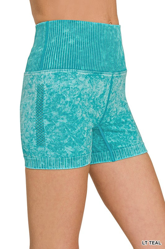 WASHED SEAMLESS HIGH WAISTED SHORTS - EYELET DETAILING - RIBBED WAISTBAND & HEM TOTAL WAIST: 22.25", INSEAM: 3.5" approx. - MEASURED FROM S/M ** COLOR MAY VARY SLIGHTLY DUE TO MONITOR RESOLUTION