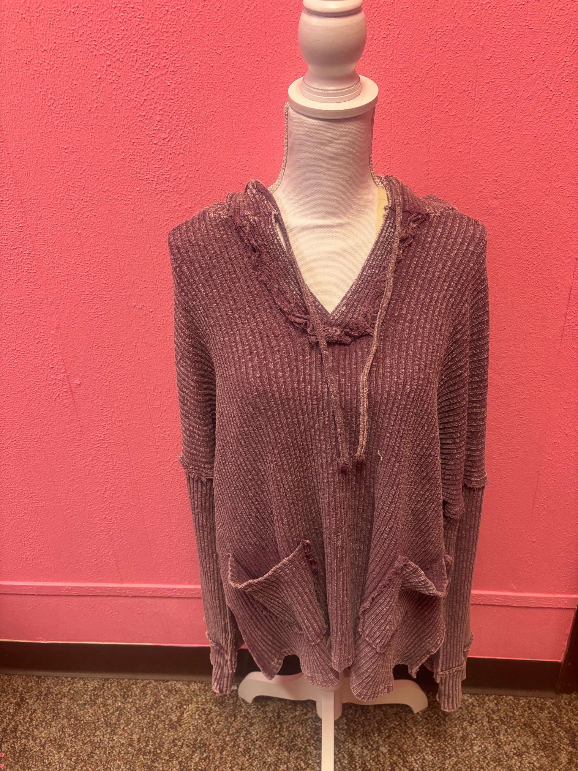 WASHED NOVELTY RIB KNIT HOODIE PULLOVER -LONG SLEEVES -DROPPED SHOULDERS -LOW FRONT POCKETS -RAW CUT AND DEFINED SEAMS